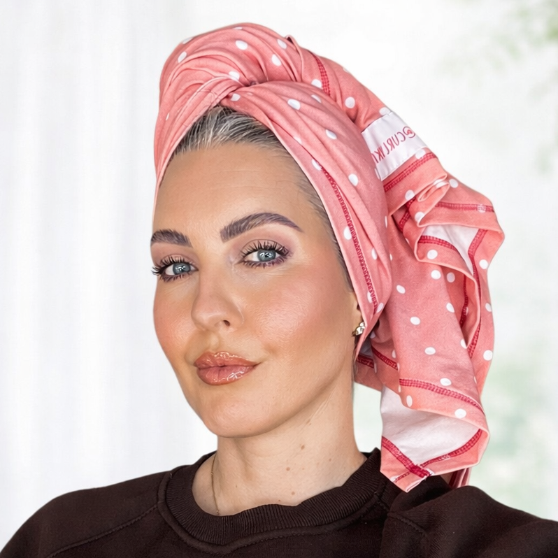 Our Limited Edition Dusty Pink Polka Dot Tee-Owel was designed in collaboration with curl icon @curlykiet, bringing a playful print to a tool your hair routine already relies on.